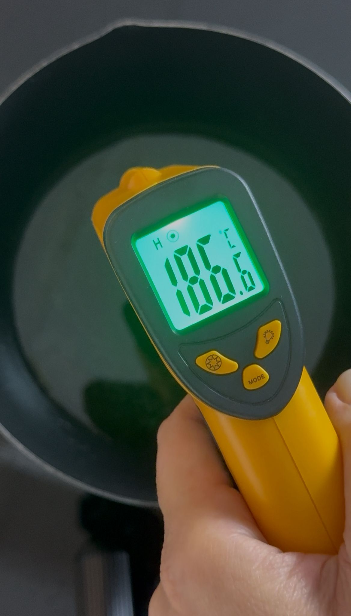 - Heat up some oil in a pan until 180°C - 200°C over low to medium heat