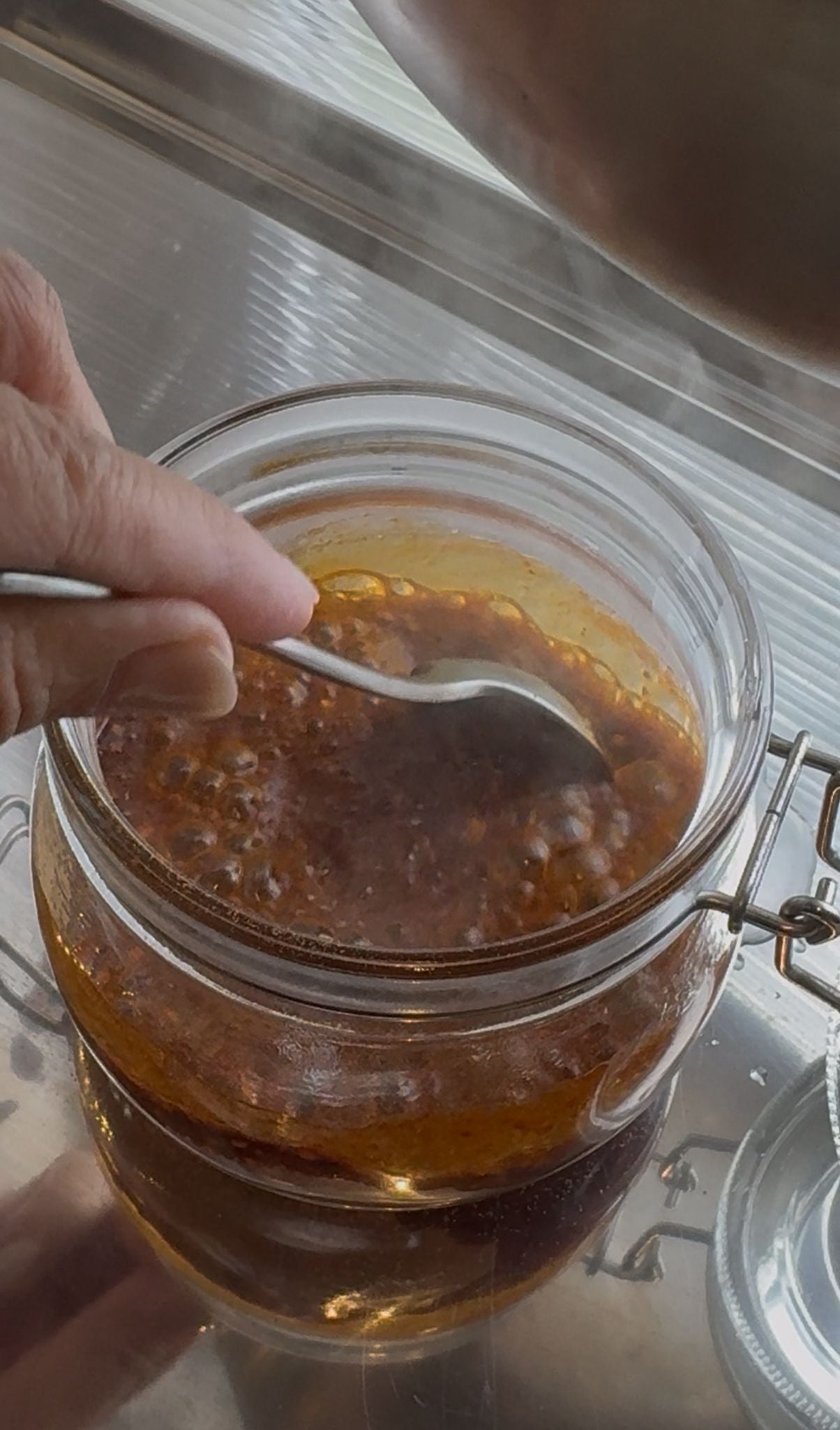 - Pour hot oil over chilli blend, stirring constantly to allow all parts to be heated without getting burnt